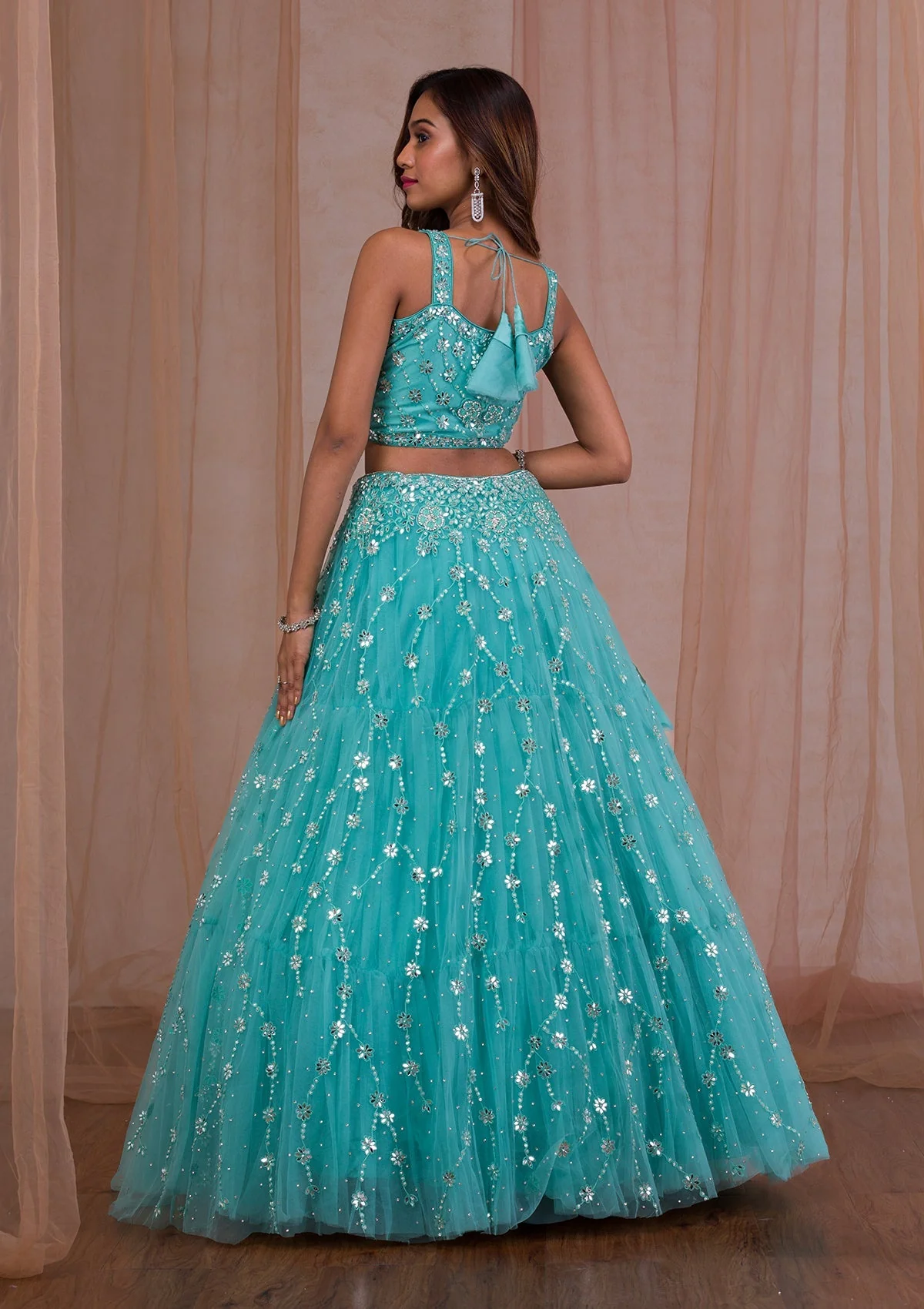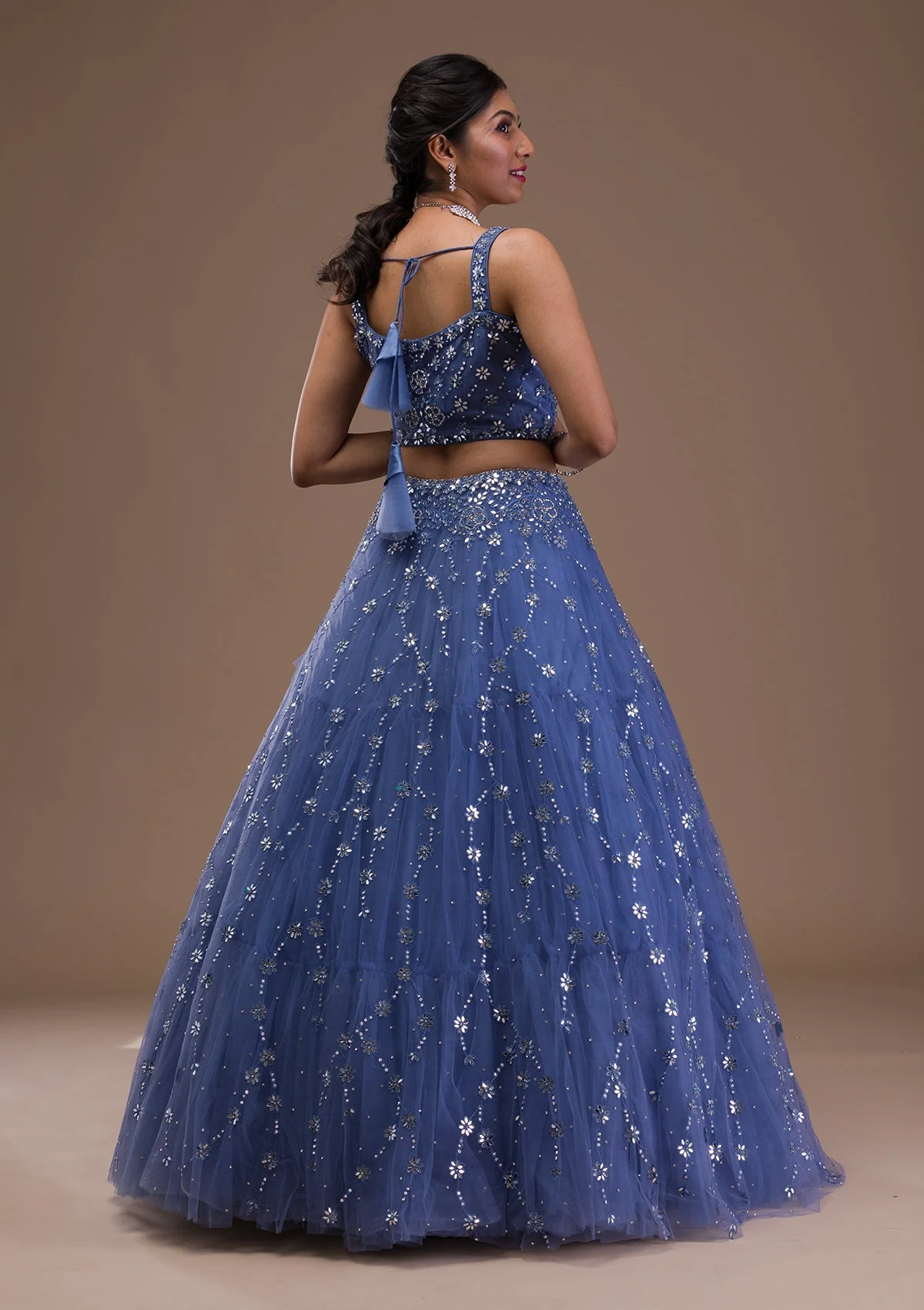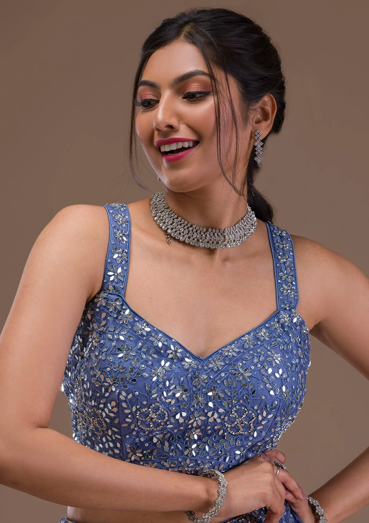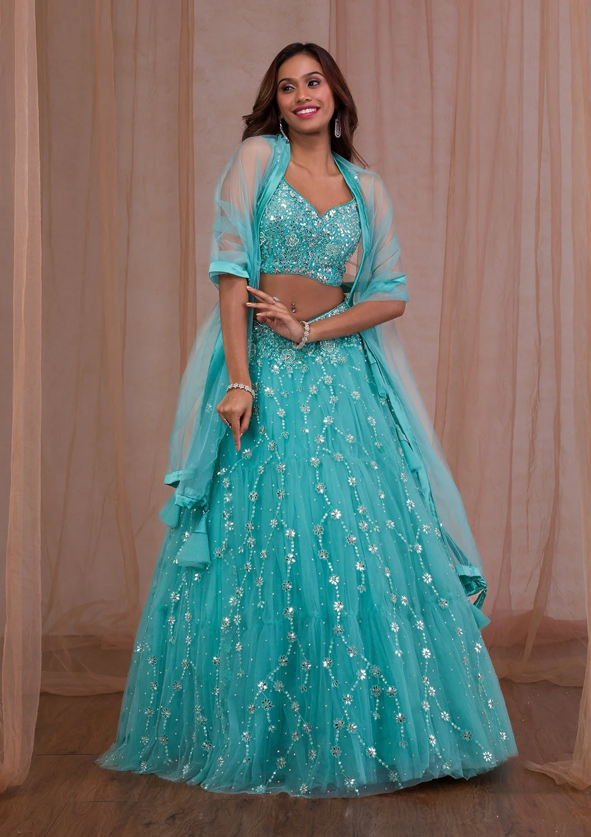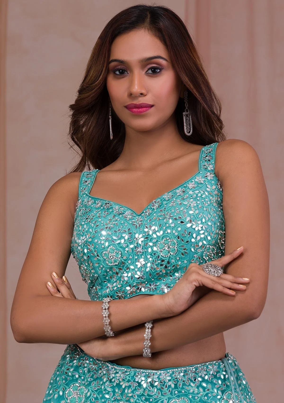 Product Category: LehengaFabric: NetWork: MirrorworkSecondary Work:Top Style: BlouseNeckline: Leaf NecklineSleeve Type: SleevelessDupatta Fabric: GeorgetteBottom Style: SkirtBottom Work: Threadwork